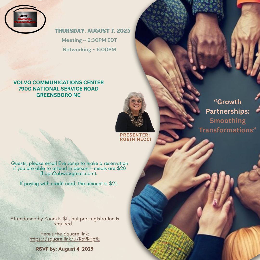 Join us as Robin Necci, Past National President, presents Growth Partnerships – Smoothing Transitions.