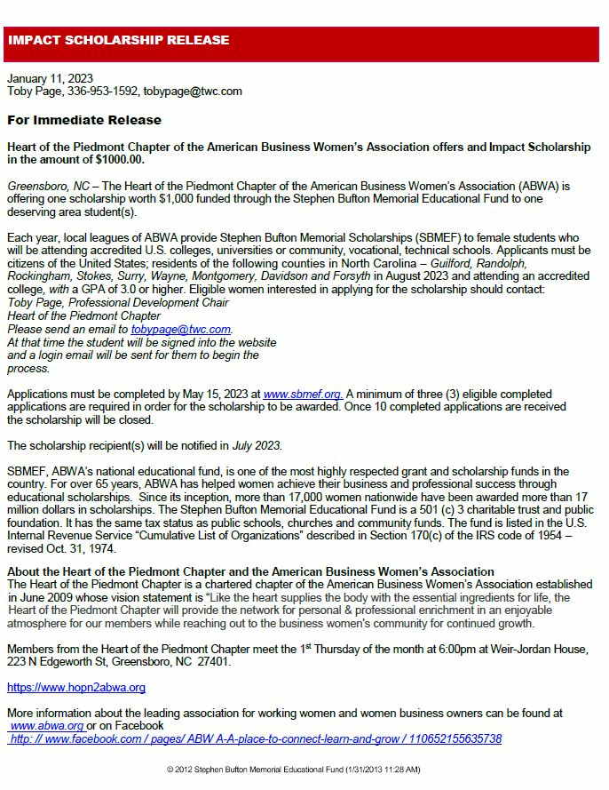 The Heart of the Piedmont Chapter of the American Business Women's Association has a $1000 Impact Scholarship opportunity available.