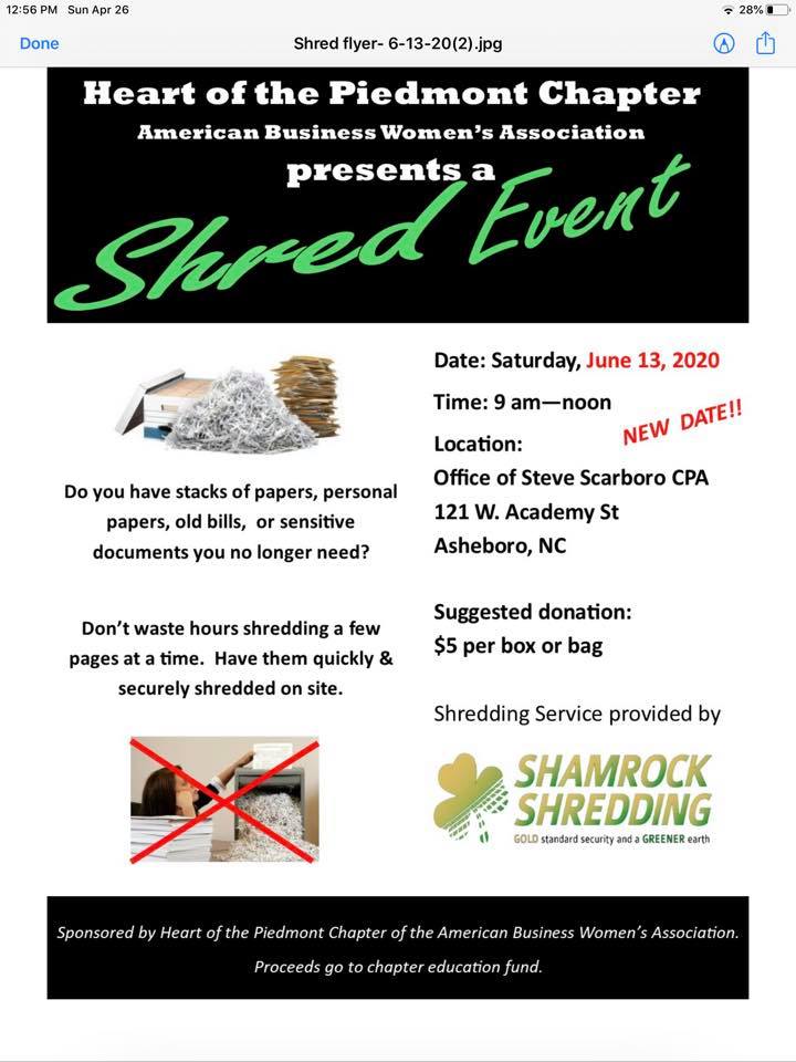 Has the Stay at Home order caused you to declutter your home? Do you have stacks of papers, personal papers, old bills or sensitive documents you no longer need? On Saturday, June 13th you can securely shred those items at the Office of Steve Scarboro CPA, 121 W Academy St, Asheboro, NC and support the Heart of the Piedmont Chapter of the American Business Women’s Association education fund. Event Time is from 9 am until noon & the suggested donation is $5 per box or bag.